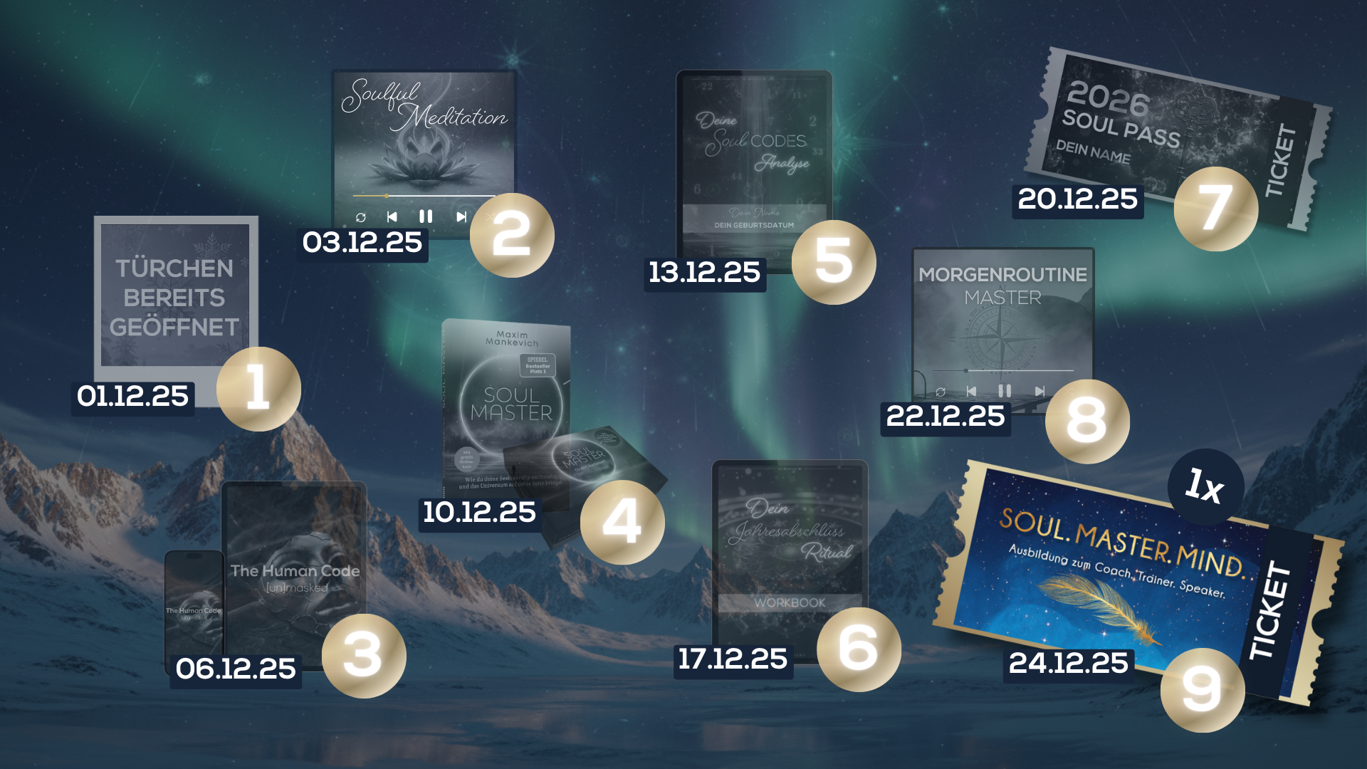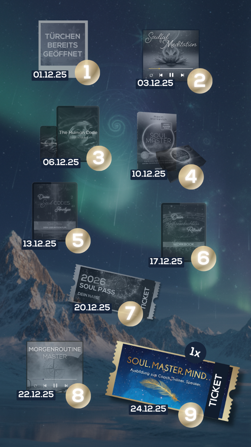 Jede Woche öffnen sich zwei neue Türchen für Dich, hinter denen sich außergewöhnliche Geschenke verstecken – Deine Chance auf unvergessliche Momente für Deine Seelenreise.